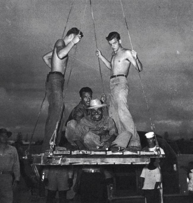 Photo: U.S. Government, 1946, Bikinian elder Lokiar being loaded onto a U.S. Navy transport ship.