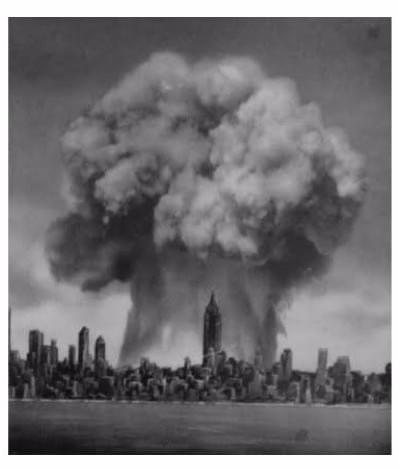 Photo: U.S. Government, 1946, "Bomb versus Metropolis," showing detonation from Bikini Atoll superimposed over the New York City skyline.